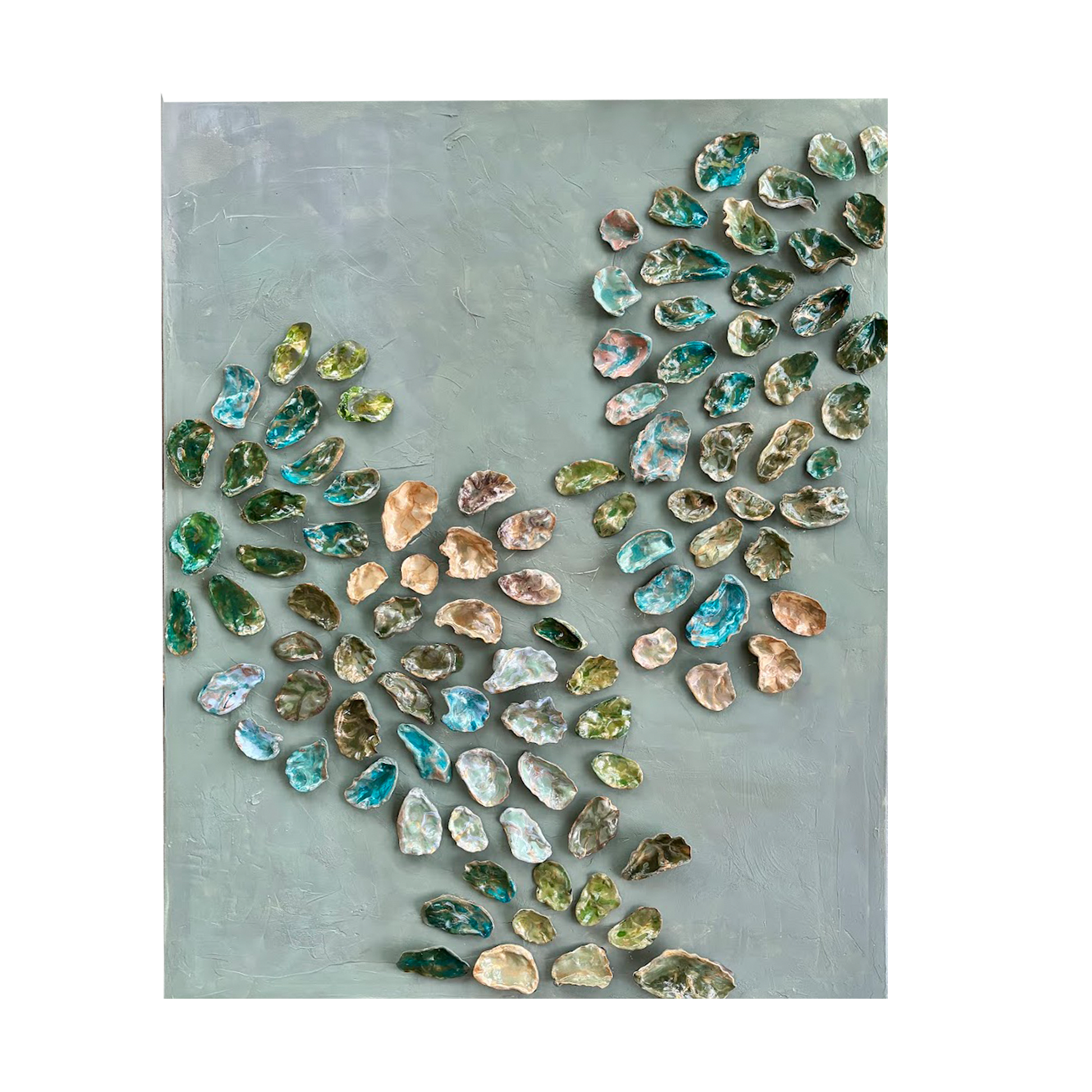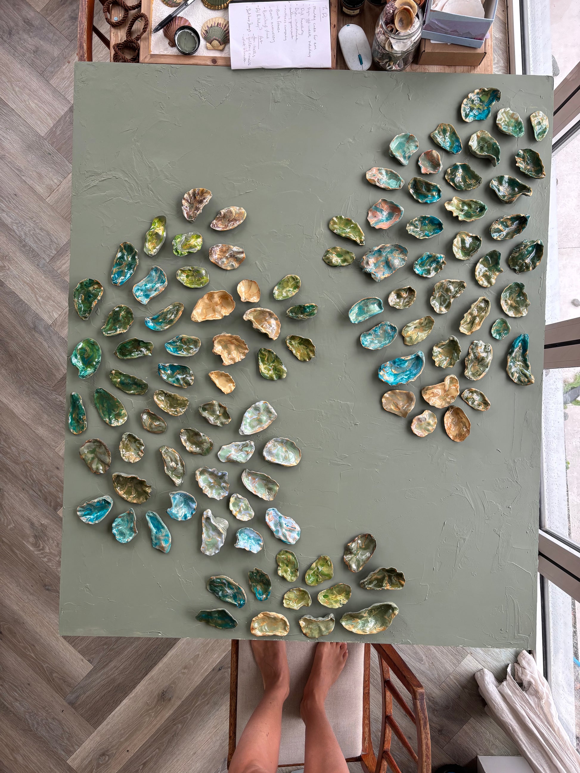A statement mixed-media artwork featuring hand-collected oyster shells, each delicately filled with resin in oceanic hues of turquoise, jade, and sand. Set against a textured hardwood panel washed in soft sage, the composition mimics the organic movement of a blooming coral formation, creating a sense of flow and depth. This luxe, coastal-inspired piece celebrates natural forms, elevating raw materials into a fluid, sculptural display perfect for a modern, ocean-connected interior.