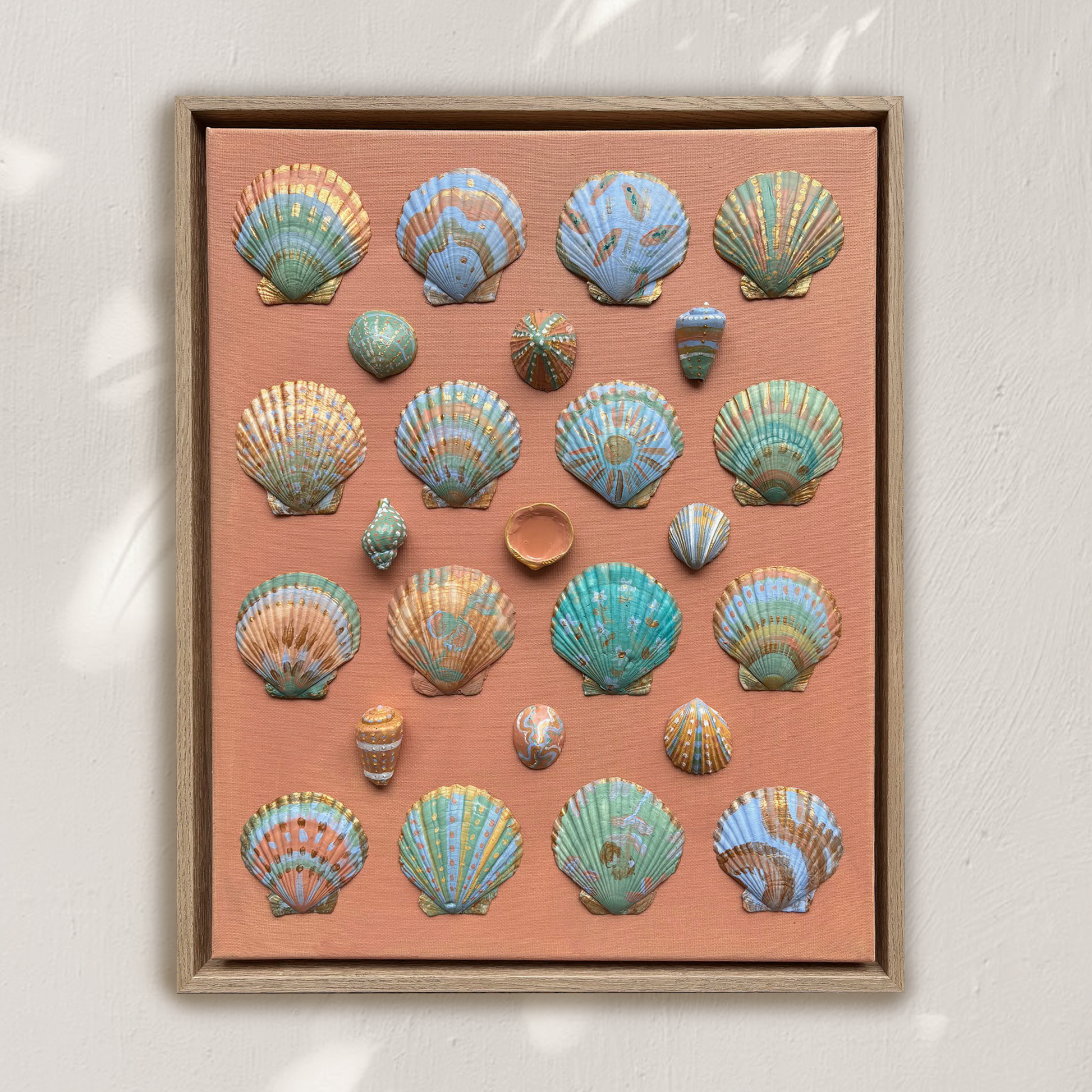 A poetic mosaic of hand-painted sea treasures, Salt & Gold: Tidal Relics captures the soul-soothing essence of coastal living. Each shell is adorned with delicate strokes of turquoise, coral, and gleaming gold—echoing the shifting light of sunrise over the sea. This curated grid balances symmetry and organic imperfection, inviting the viewer to slow down and reconnect with nature’s rhythm. A celebration of stillness, texture, and the quiet magic found at the ocean’s edge.
