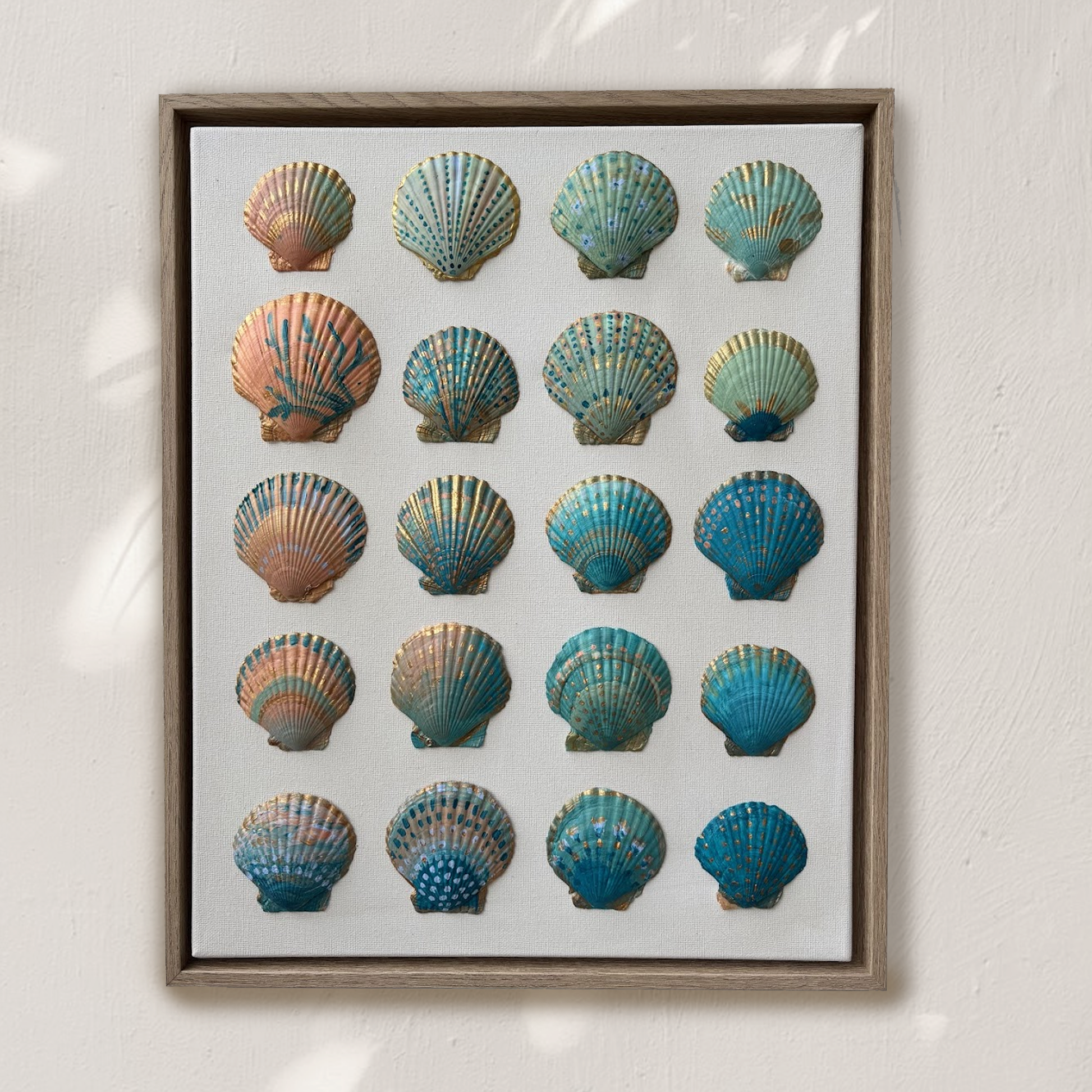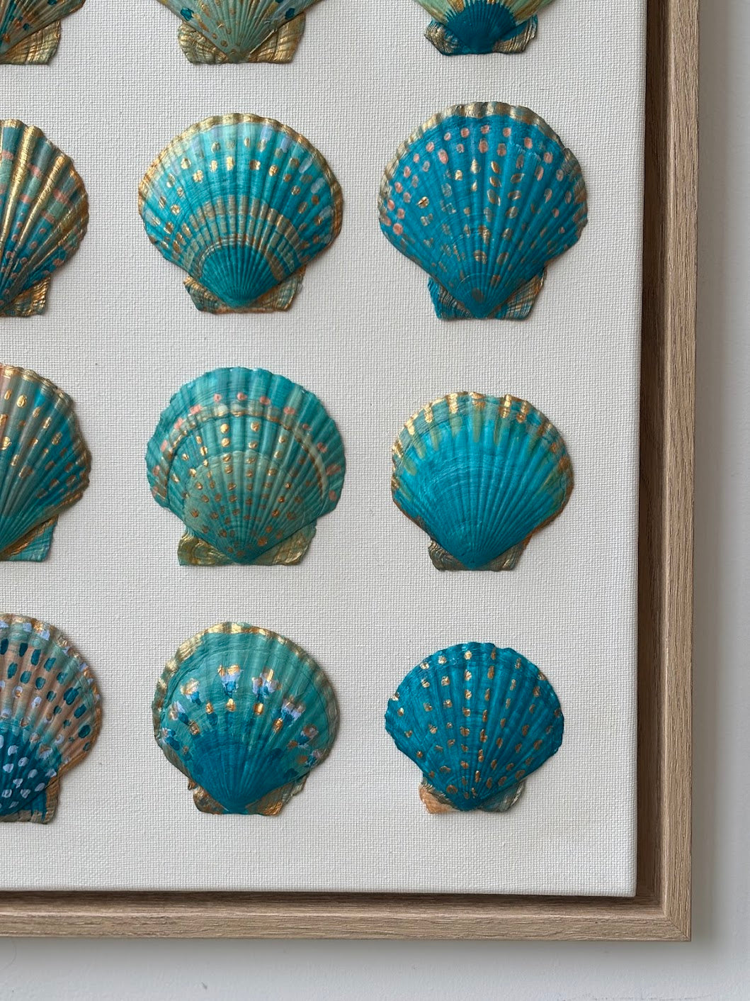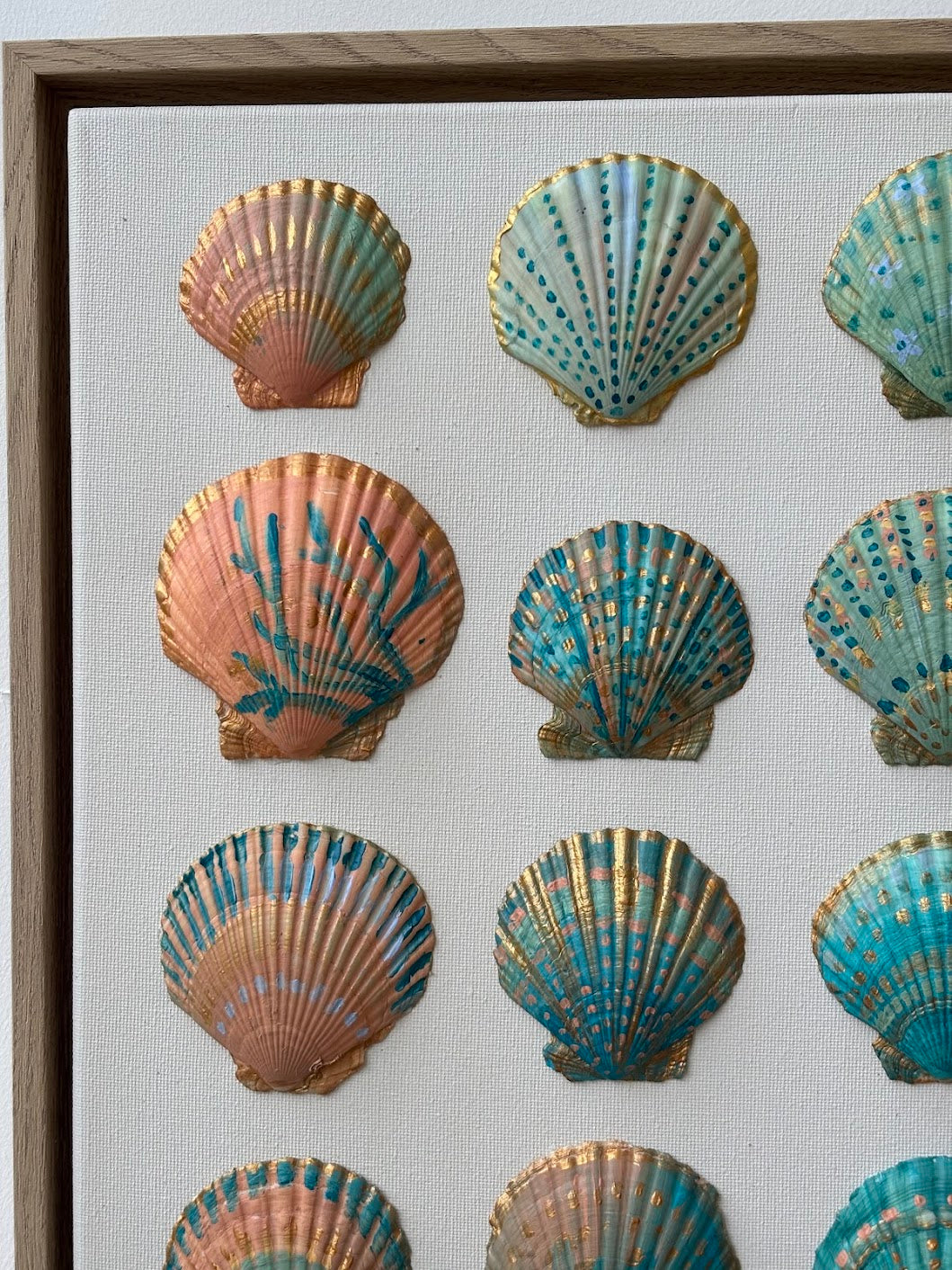 A meditative composition of hand-painted coastal finds, this piece evokes the gentle rhythm of the sea. Each shell is delicately detailed in hues of turquoise, coral blush, and gold leaf—reflecting the shimmer of dawn tide pools. Arranged in a harmonious grid, the work balances structured calm with the imperfect beauty of nature. A quiet ode to the coast—its textures, stillness, and the soulful treasures it leaves behind.