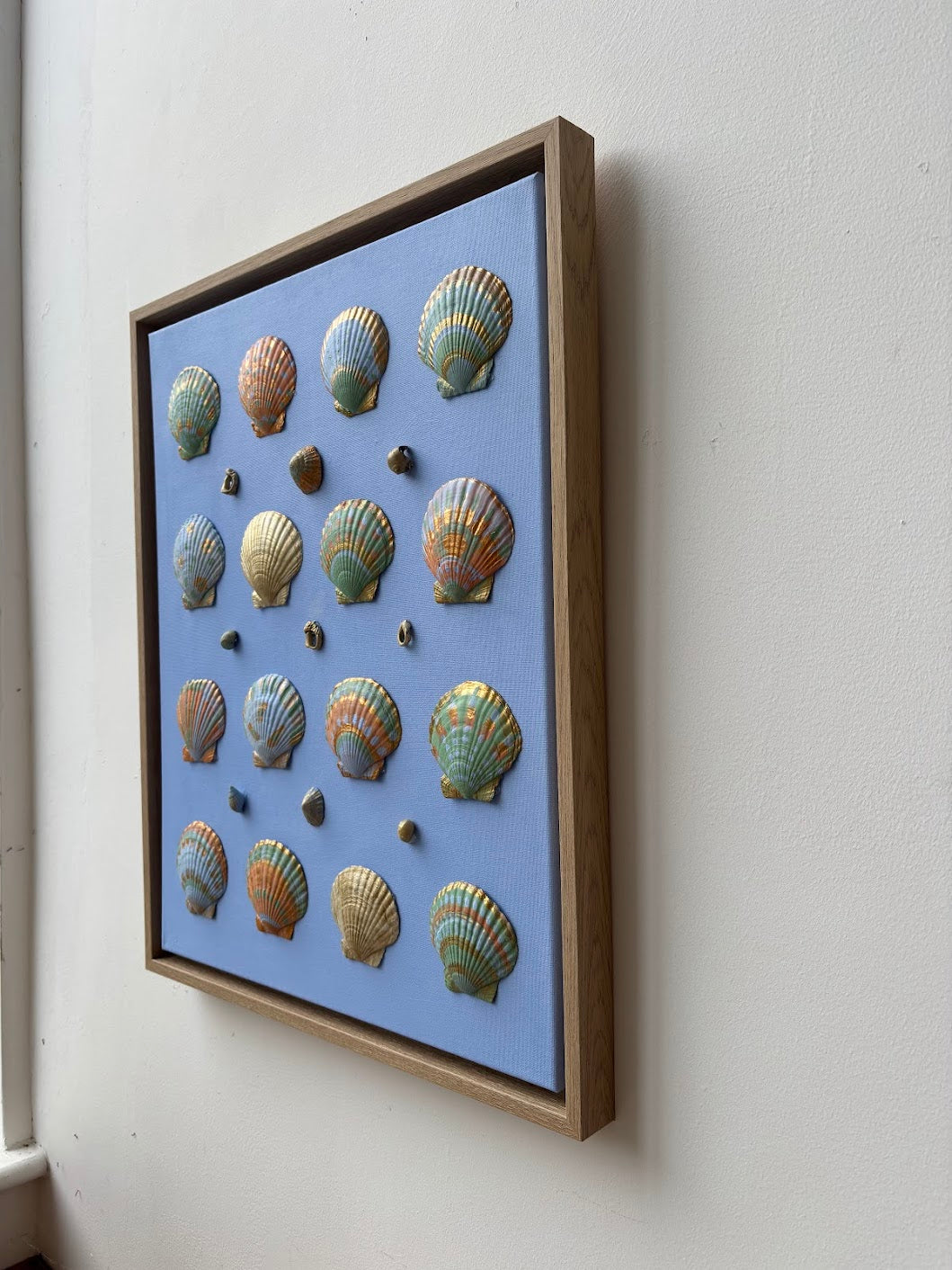 A meditative composition of hand-painted coastal finds, this piece evokes the gentle rhythm of the sea. Each shell is delicately detailed in hues of powder blue, turquoise, coral blush, and gold leaf—reflecting the shimmer of dawn tide pools. Arranged in a harmonious grid, the work balances structured calm with the imperfect beauty of nature. A quiet ode to the coast—its textures, stillness, and the soulful treasures it leaves behind.