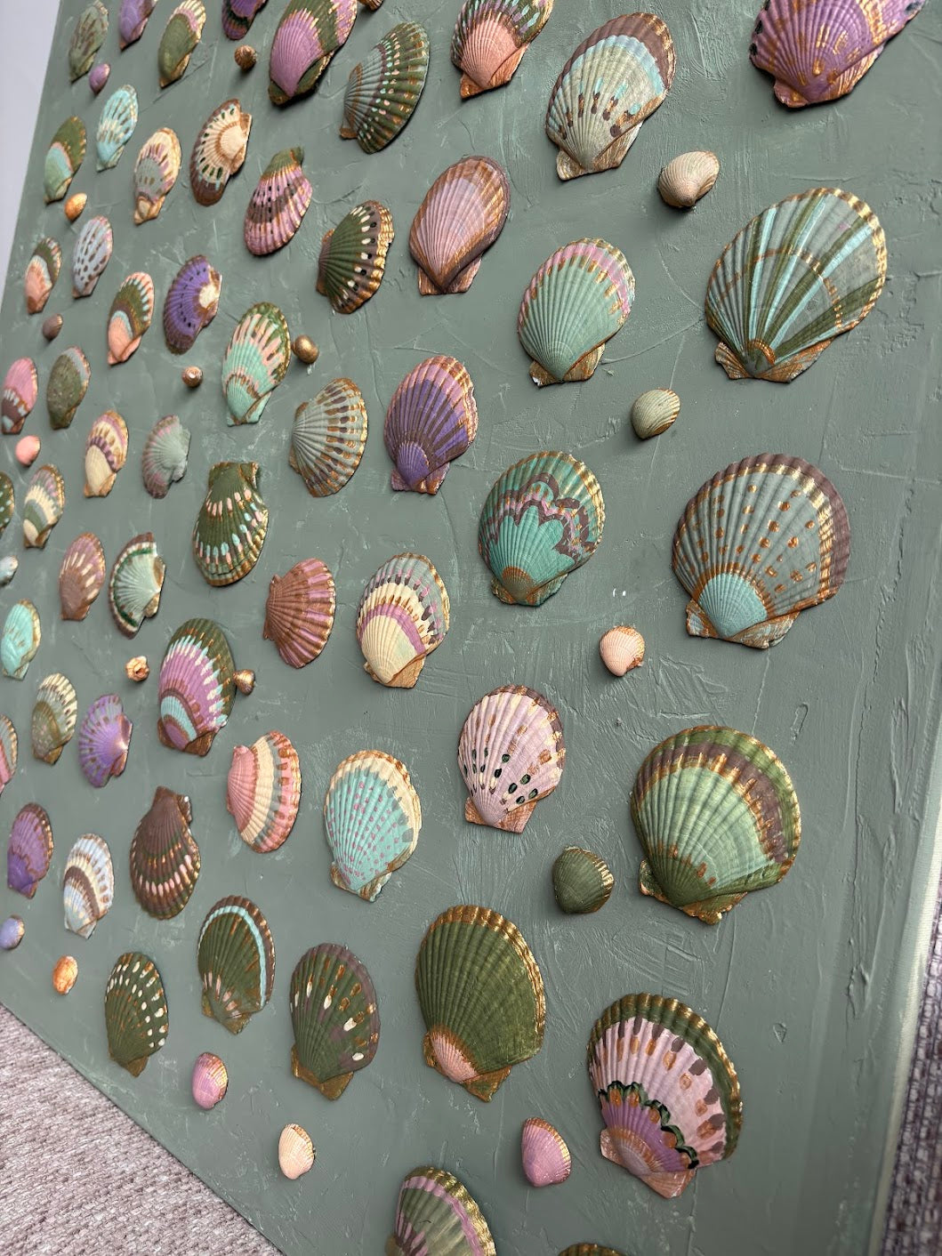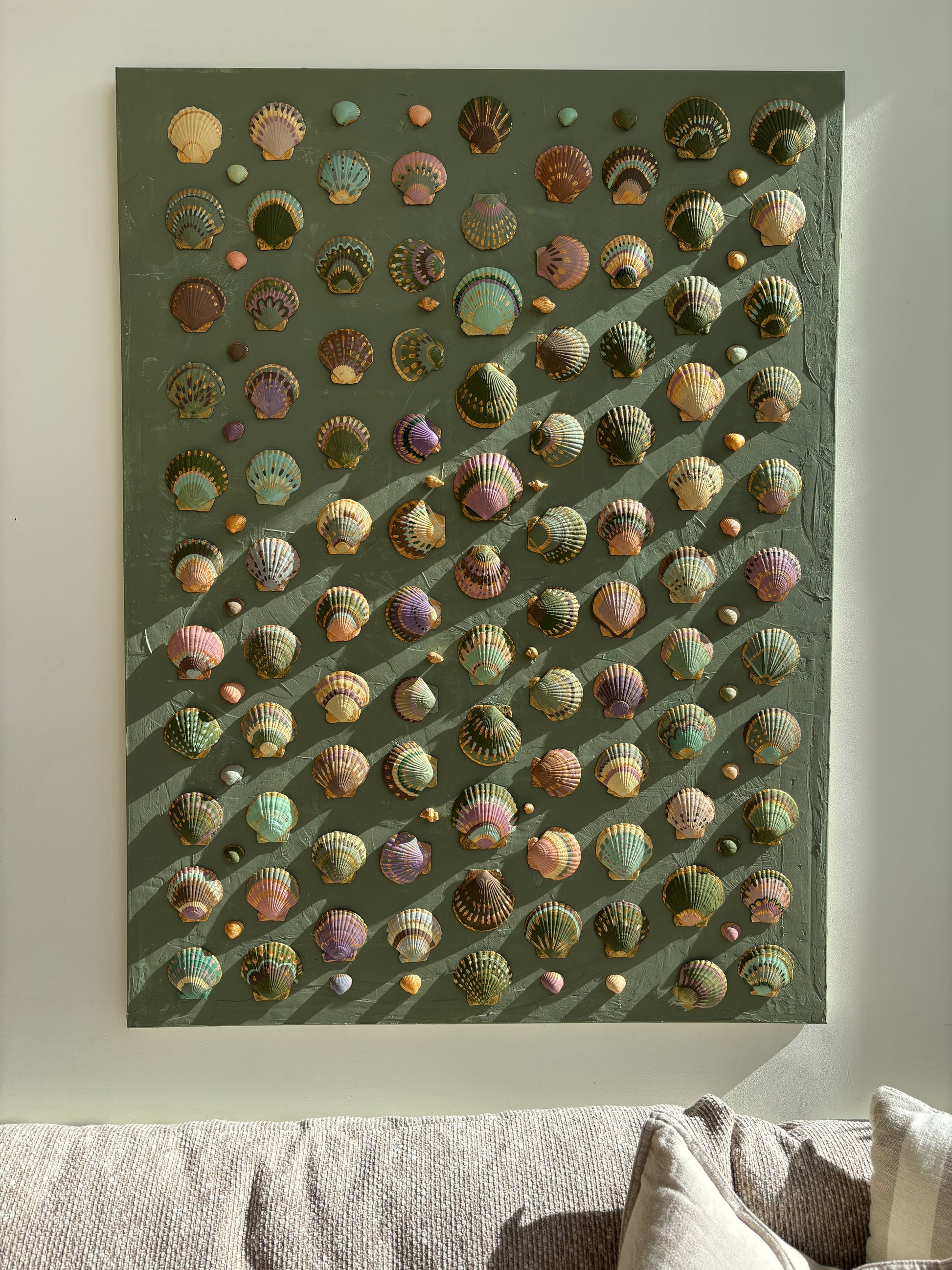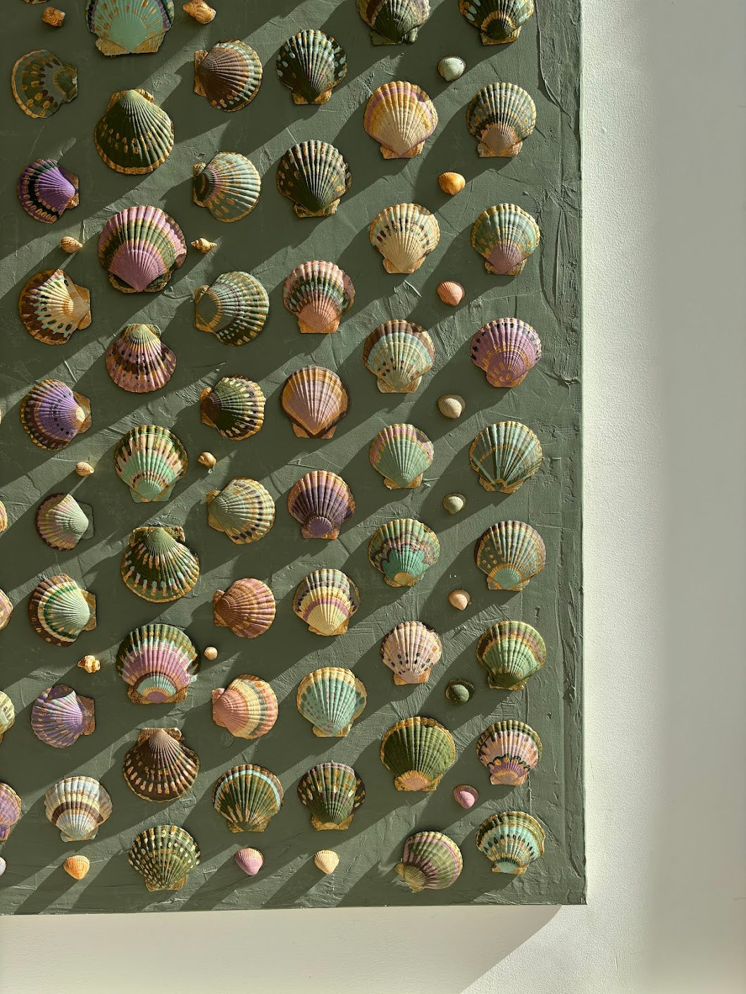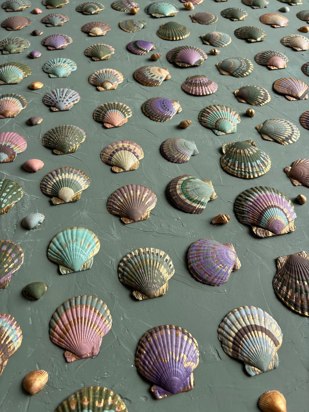 Rhythmic rows, echoing the movement of the tides. Their soft rainbow tones, brushed with golden highlights, create a prism-like effect that feels both natural and dreamlike—capturing the balance between the order of nature and the magic of the sea.