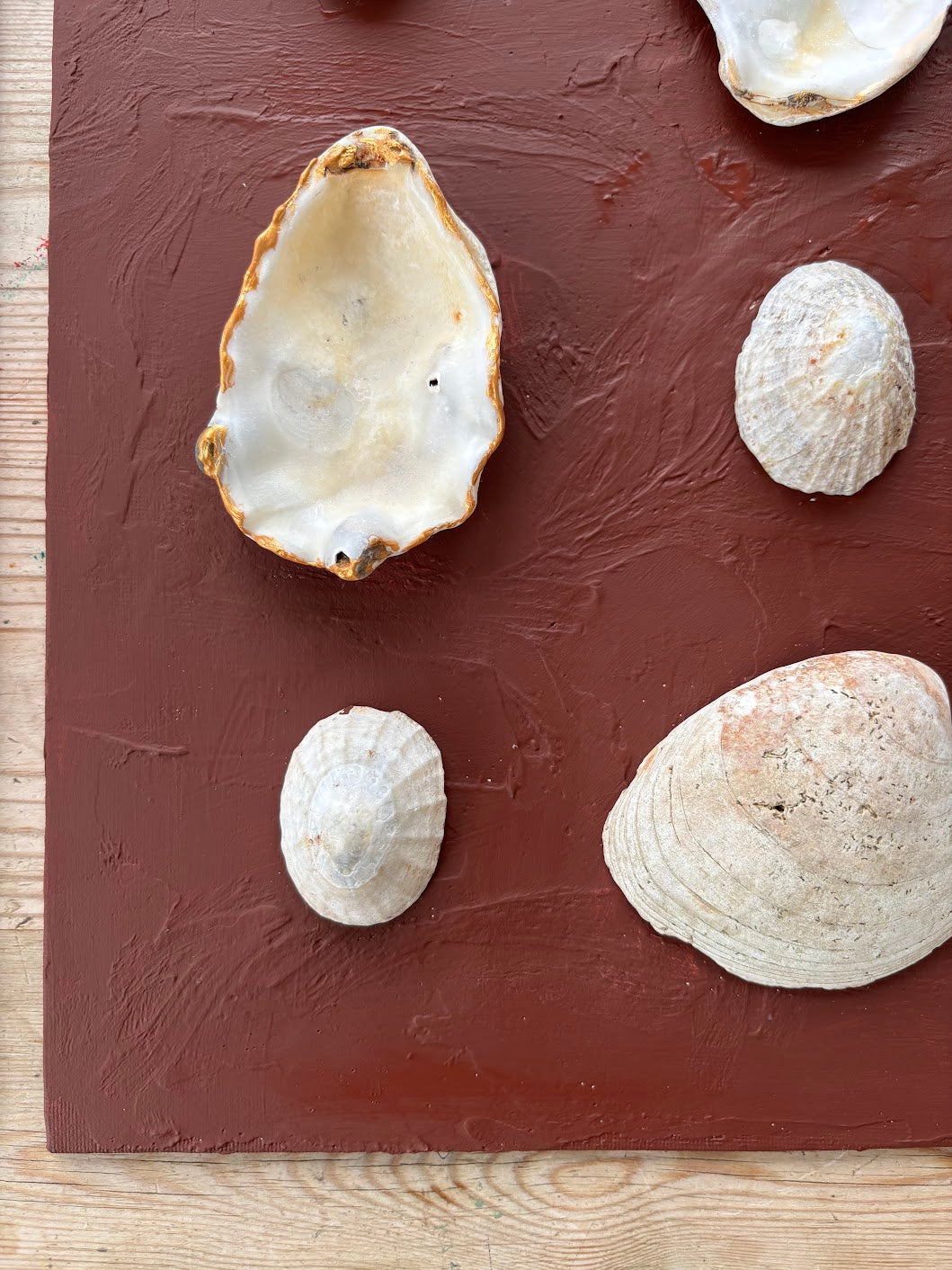 A striking composition of organic shells set against a richly pigmented, earthy clay backdrop. Each shell has been hand-collected and thoughtfully placed, creating a rhythmic balance that recalls tidal patterns and natural formations along the shoreline. Subtle textures in the clay ground enhance the depth and tactile quality of the piece, while the shells bring a raw, sculptural presence.